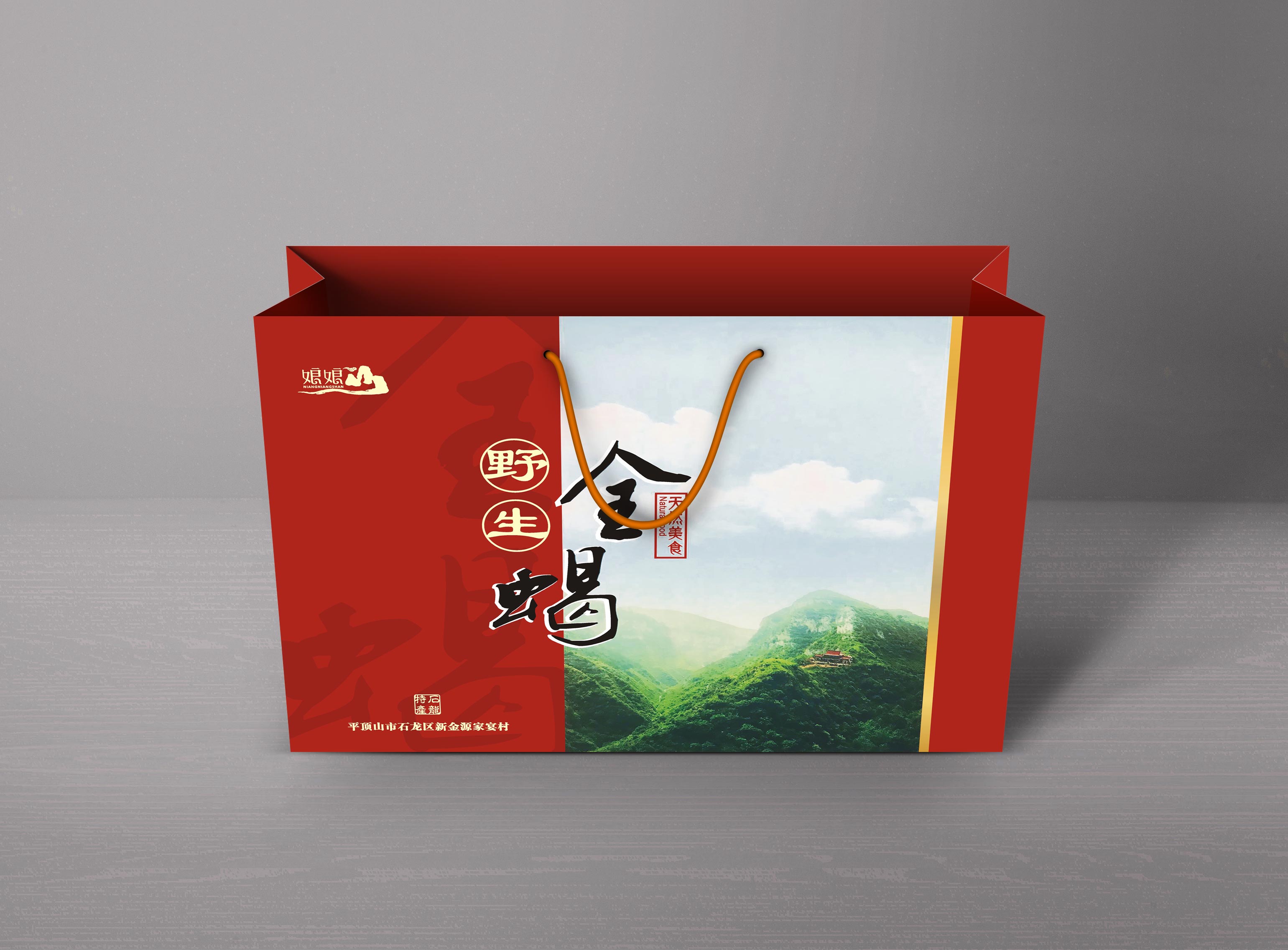 這位客戶的“全蝎”出自娘娘山,故而此包裝設(shè)計(jì)元素采用平頂山市石龍區(qū)娘娘山圖片為搭配使其與logo(娘娘山)上下呼應(yīng)。